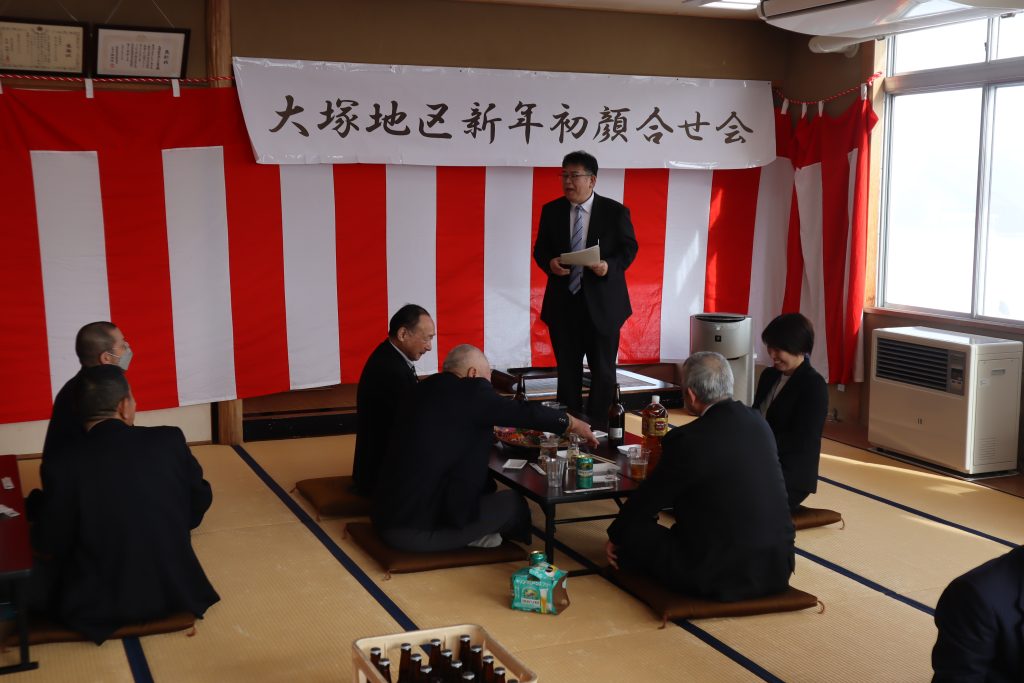 令和8年1月10日(土)に大塚地区交流センターにおいて、地区民一同が集う新年会を行いました。第一部「安全安心集会」、第二部「懇親会」を行い、総勢30名の参加を頂きました。町からは政策推進課長色摩良一様にお越し頂き町からの安全安心メッセージと新年のご挨拶をして頂きました。また、地区の5団体より安全安心宣言文の発表をして頂きました。懇親会では、参加者各々が膝を合わせ懇談し親睦を深めておりました。地区の皆様、本年もどうぞよろしくお願い致します。